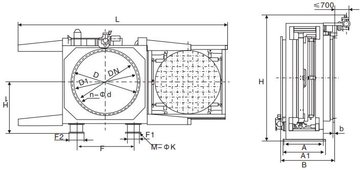 DN | D | D1 | B | b | n-d | H | H1 | L | A | A1 | F | F1 | F2 | M-K | 電動功率(kw) | 質量(kg) | ||||
